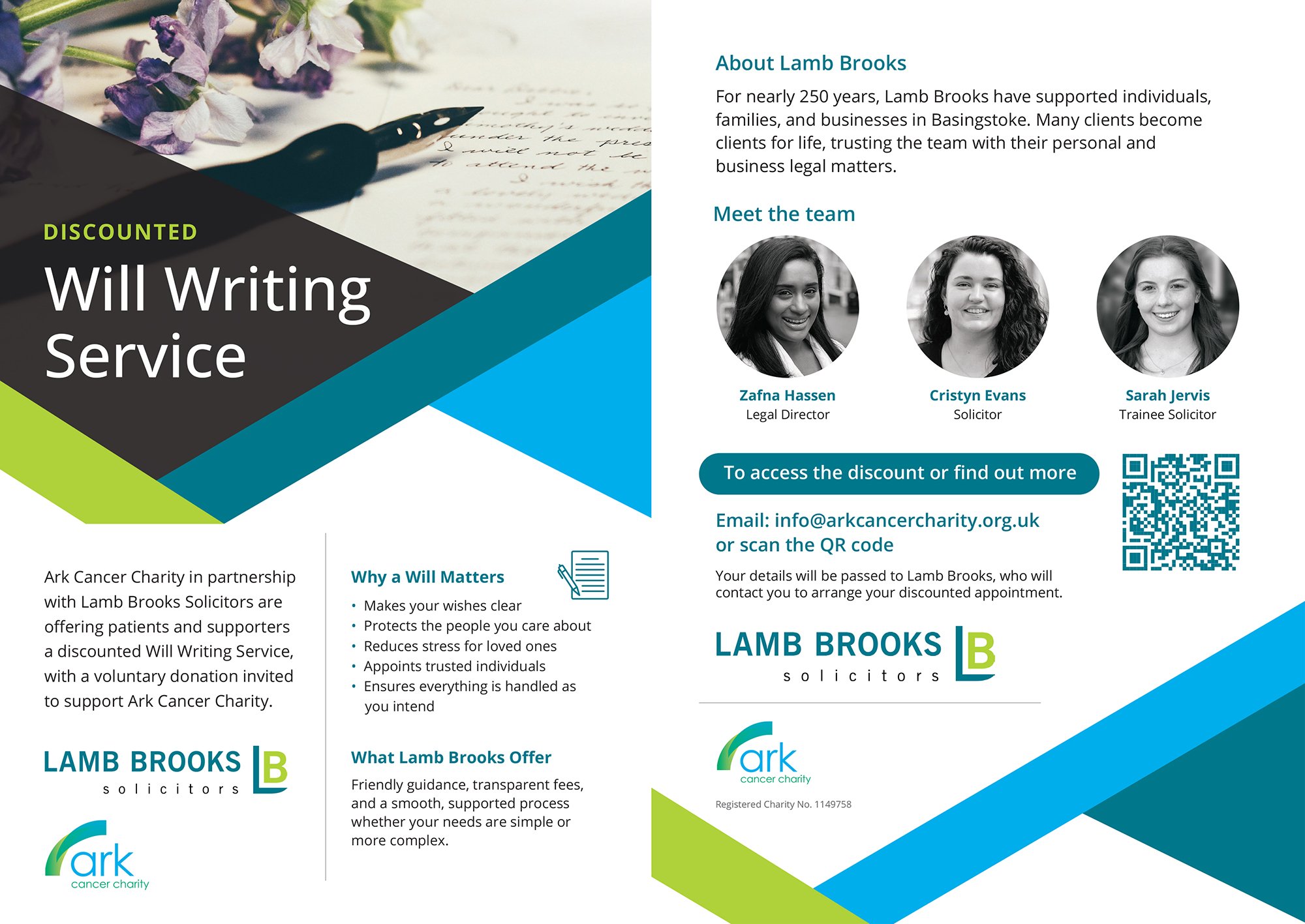 Ark Cancer Charity is delighted to be partnering with Lamb Brooks Solicitors to offer patients and supporters a discounted Will Writing Service. For further details please contact info@arkcancercharity.org.uk